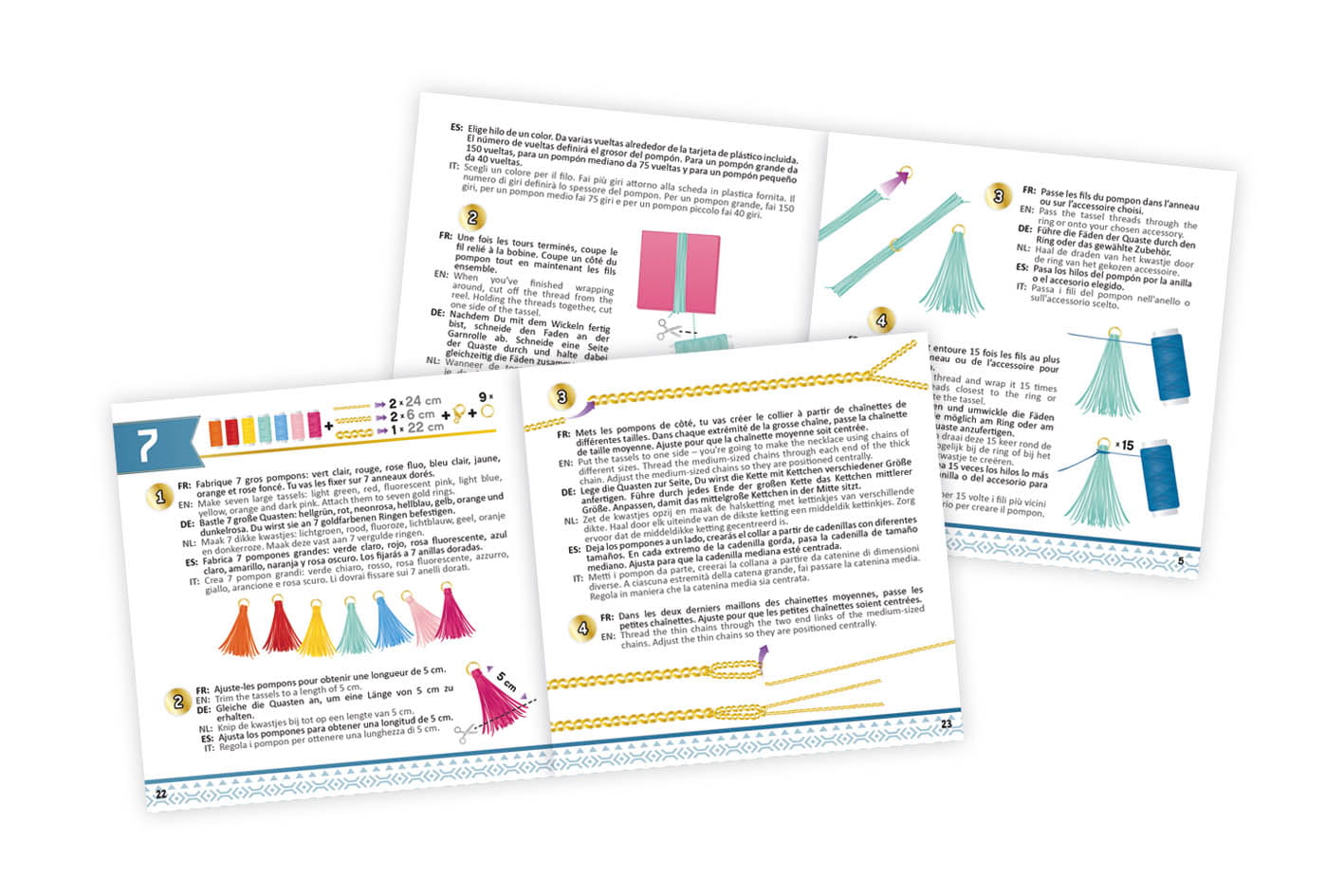 Twórz kolorowe chwosty z nici, następnie przymocuj je do łańcuszków, lub