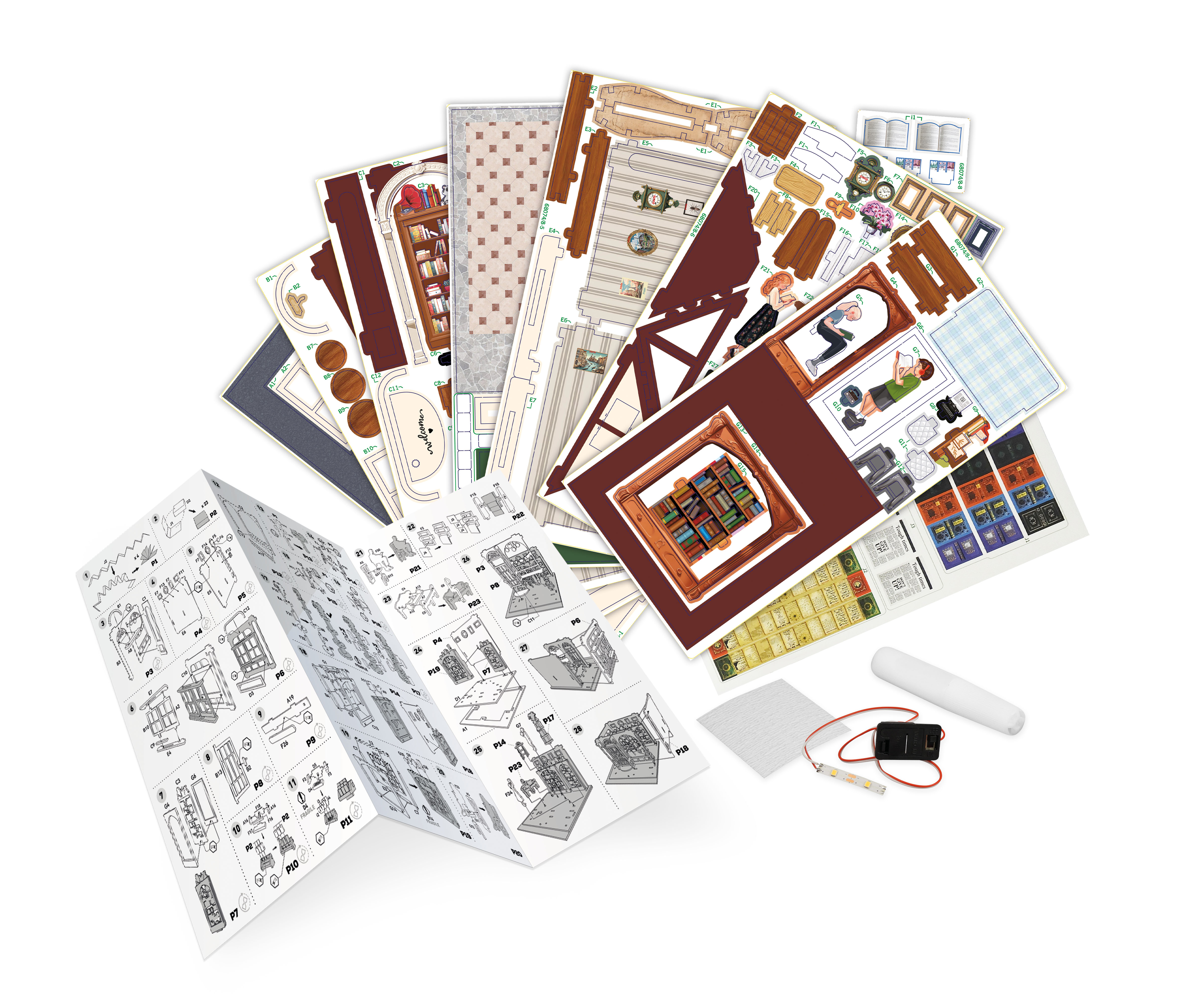 W domku należy zainstalować światełko LED (załączone do zestawu), które rozjaśni jego wnętrze i doda nastrojowego charakteru. Złożona księgarnia może stanowić piękną ozdobę wybranego miejsca w domu. Uwagę przykuwają liczne detale takie jak postacie, stojak na gazety, miniaturowe książki i inne.