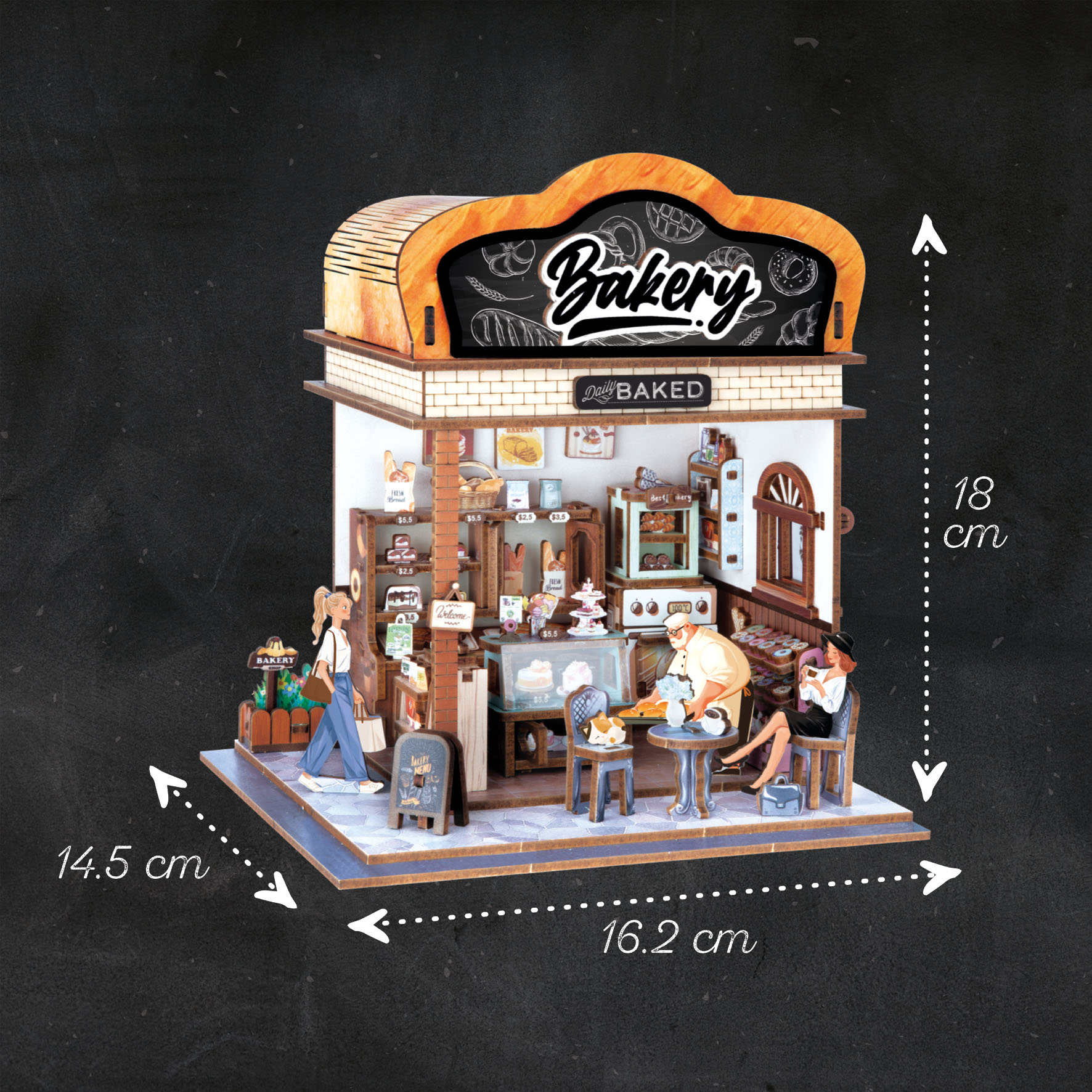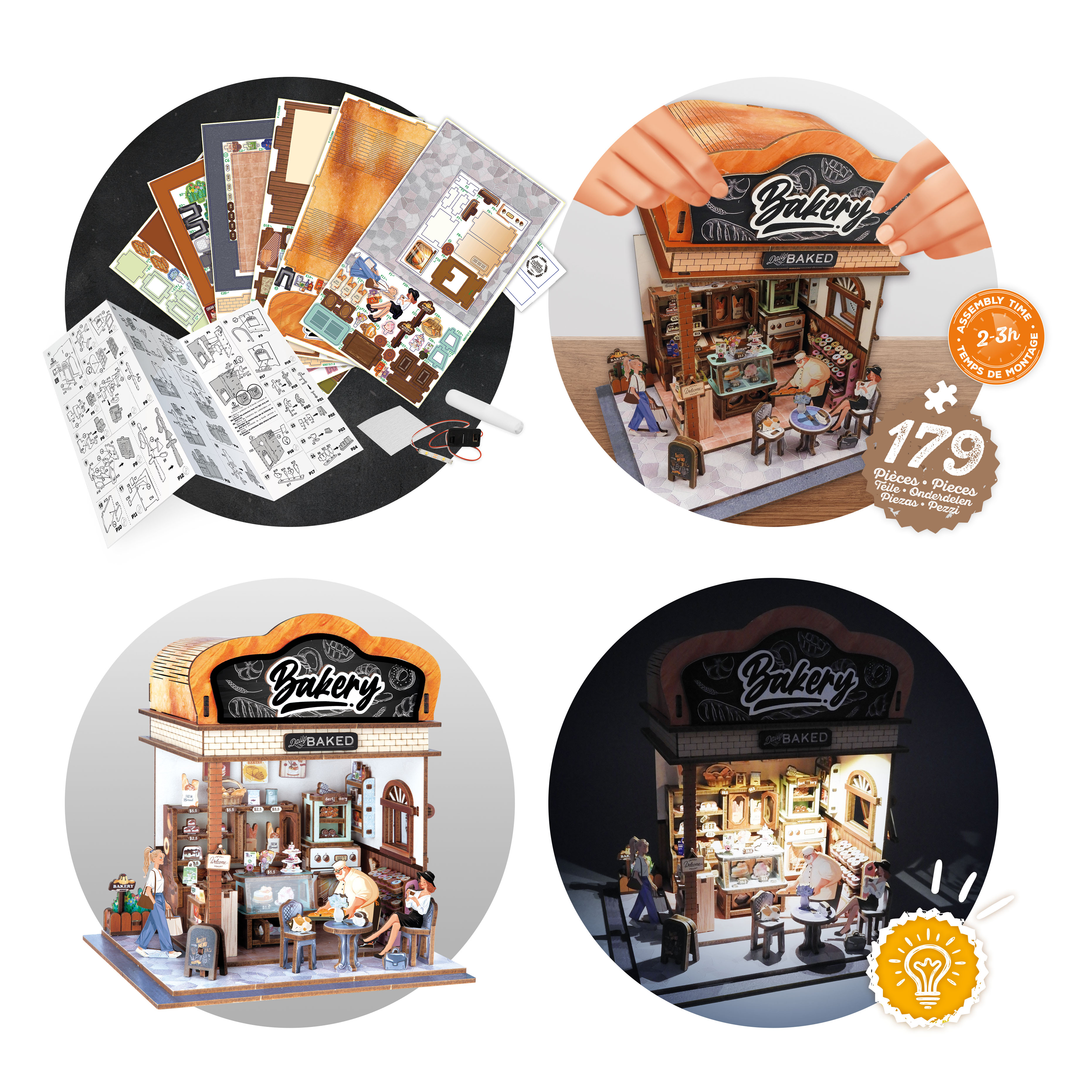 W domku należy zainstalować światełko LED (załączone do zestawu), które rozjaśni jego wnętrze i doda nastrojowego charakteru. Złożona piekarnia może stanowić piękną ozdobę wybranego miejsca w domu. Uwagę przykuwają liczne detale takie jak postacie, pieczywo, plakaty, piekarnik i inne.