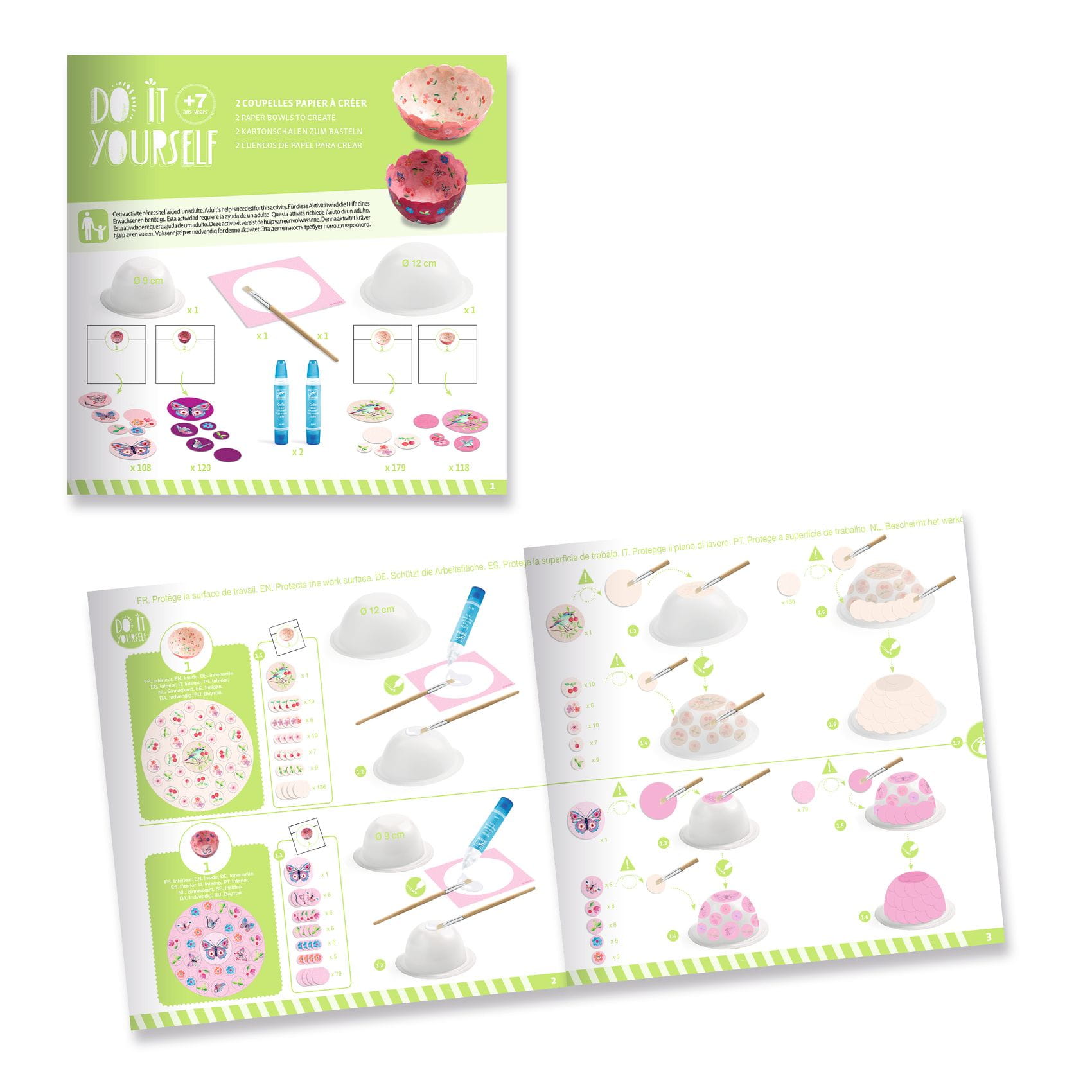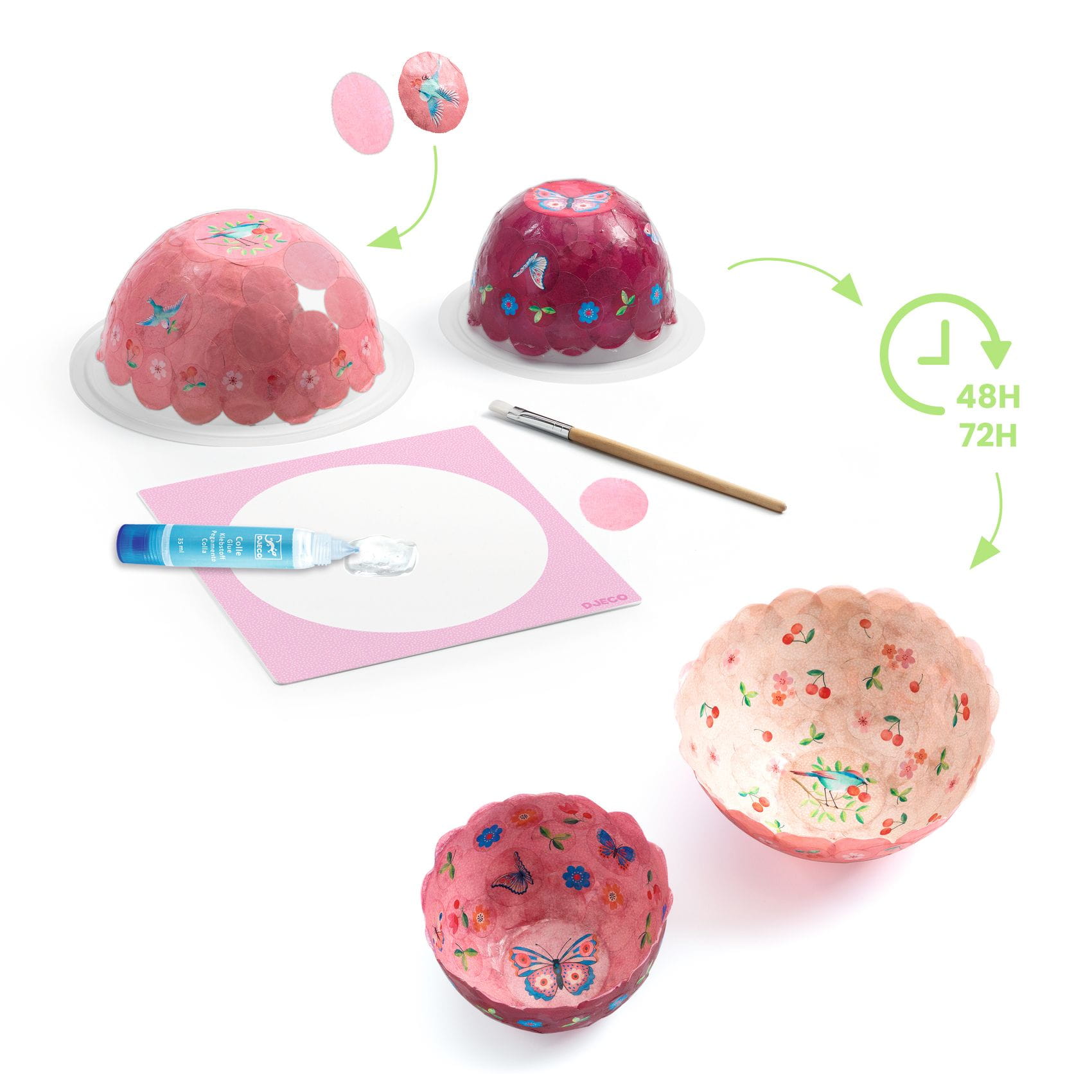 Zawartość: 2 miseczki (w 2 rozmiarach: ø 9 x 5.5 cm / ø 12 x 6 cm), 2 tubki płynnego kleju, 1 paletka, 1 pędzelek, 4 torebeczki z dużymi elementami konfetti, instrukcja krok po kroku.