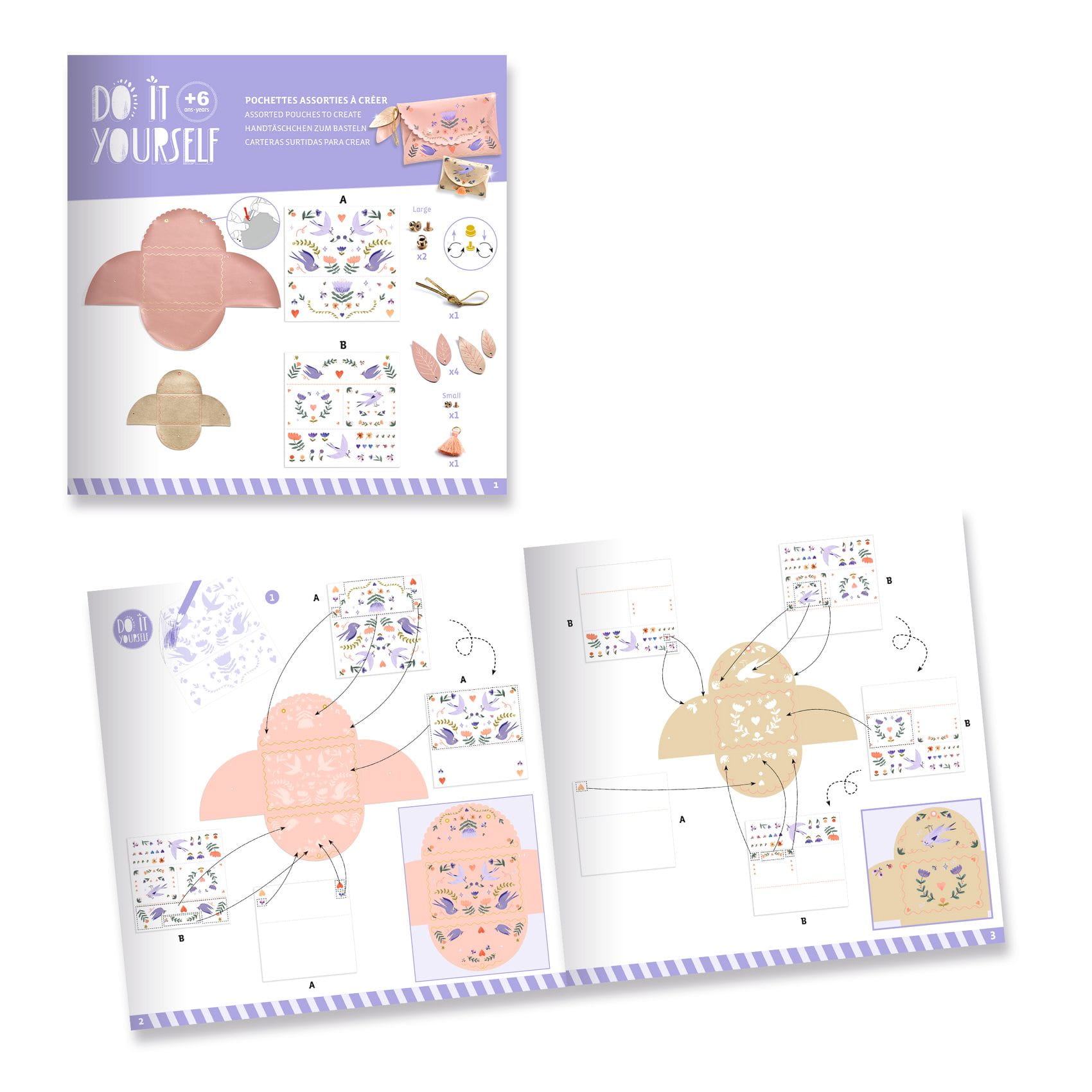 Zestaw artystyczny do samodzielnego zrobienia torebki kopertówki i pasującej do niej portmonetki ze sztucznej skóry. Za pomocą ołówka dzieci kalkują dostępne na szablonach ozdoby: ponad 100 wzorów do wyboru! Można korzystać z dostępnych projektów lub dać się ponieść swojej wyobraźni. Każdą torebkę można ozdobić dodatkowo pomponem, łańcuszkiem lub skórzanymi dekoracjami. Produkt wykonany z papieru i kartonu z certyfikatem FSC®.