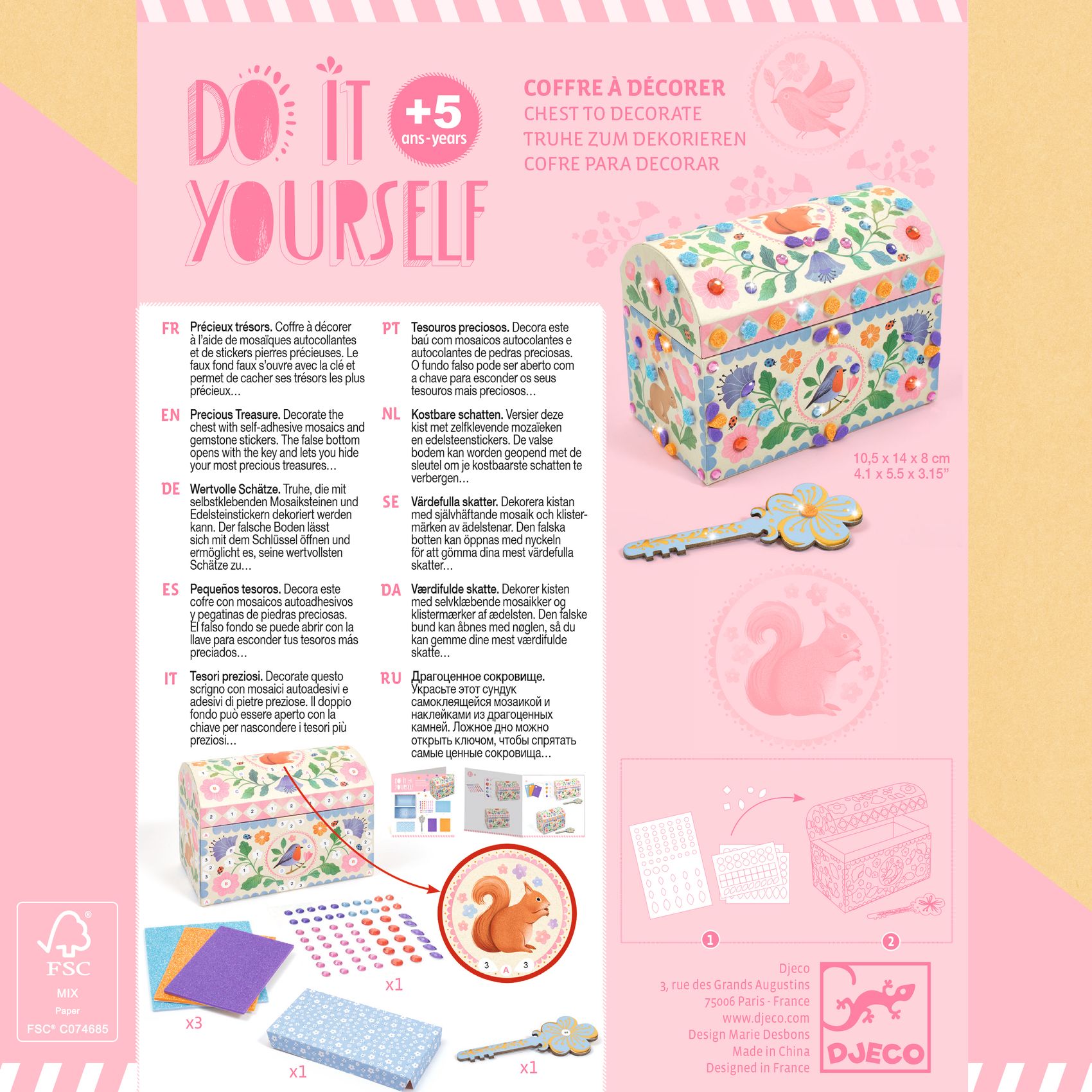 Zestaw zrób to sam do stworzenia ozdobnej szkatułki ilustrowanej motywem kwiatowym. Do dekoracji posłuży aż 150 naklejek w kształcie ozdobnych kamyczków i kwiatów z metalicznym połyskiem. Pudełko posiada drugie dno, zamykane na kluczyk, dzięki któremu dzieci mogą ukryć swoje największe skarby.