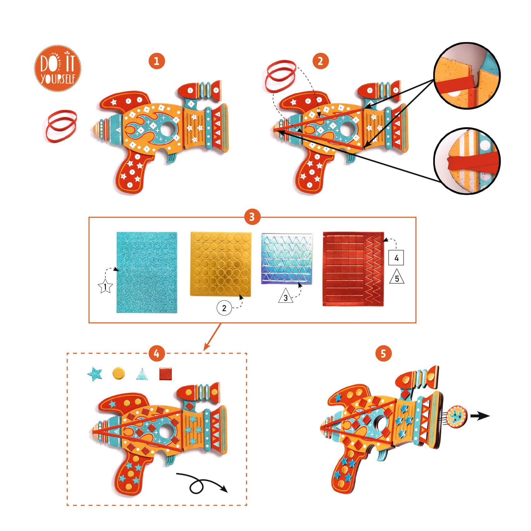 Zawartość: 3 wyrzutnie do żetonów z grubego kartonu, 15 żetonów, 6 gumek recepturek, 4 karty z piankowymi naklejkami, 1 instrukcja.