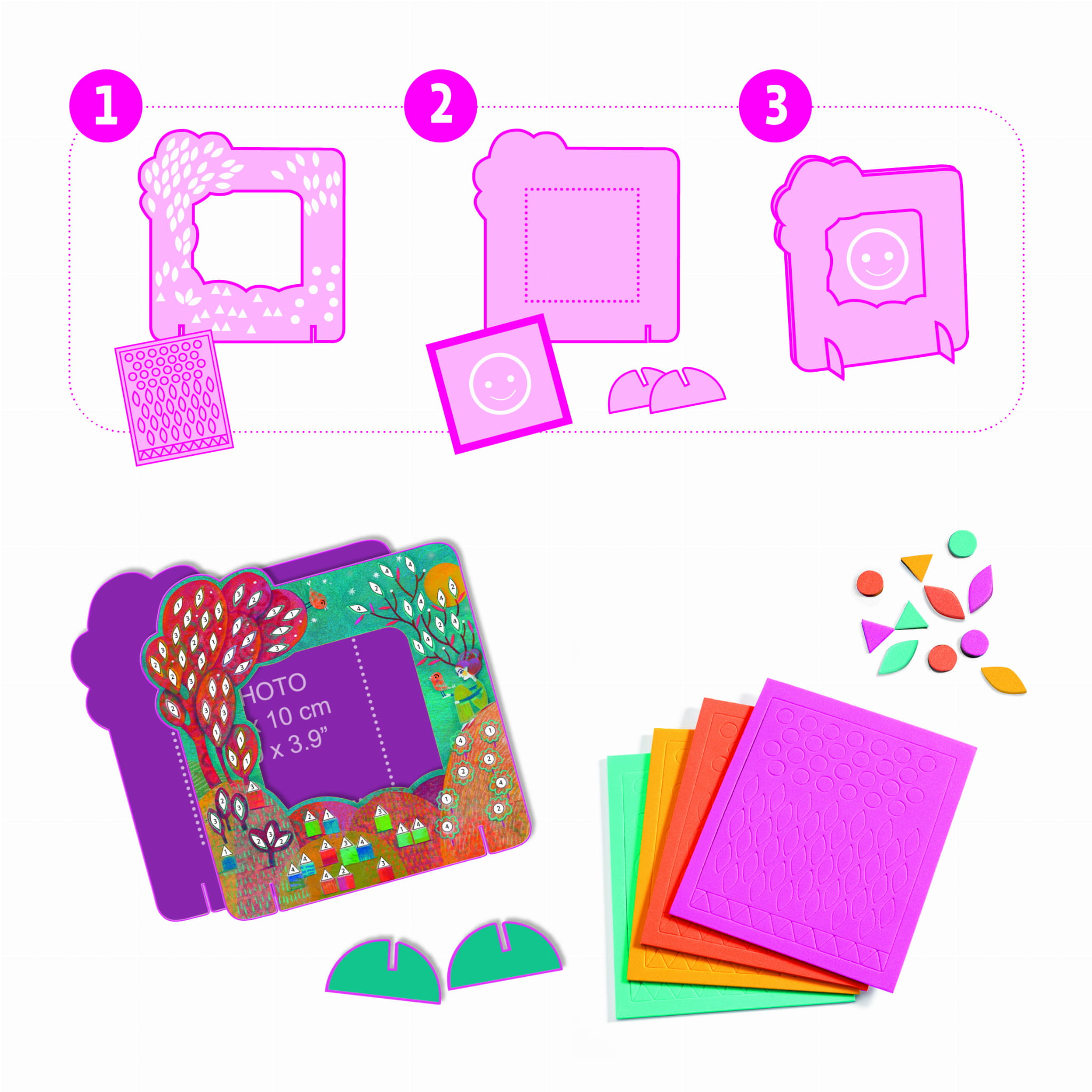Zestaw do samodzielnego wykonania i ozdobienia ramek na zdjęcia z motywami wróżek. Ramki pasują do zdjęć o standardowych formatach: 15x10 cm, 10x15 cm, 10x10 cm.