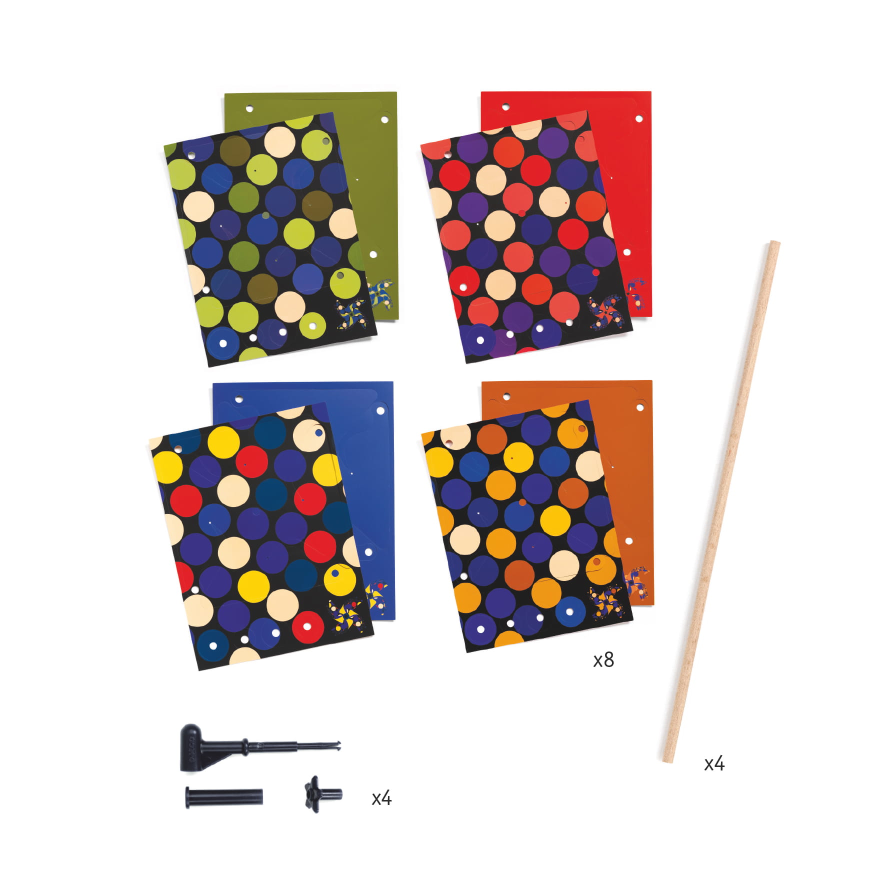W skład zestawu wchodzą : 4 drewniane patyczki, 8 laminowanych arkuszy papieru z grafiką,4 plastikowe blokady